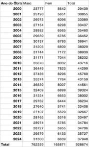 A tabela de óbitos por acidentes de trânsito no Brasil entre 2000 e 2024, construída a partir do SIM – Sistema de Informações sobre Mortalidade (Ministério da Saúde), revela um padrão claro, contínuo e alarmante: